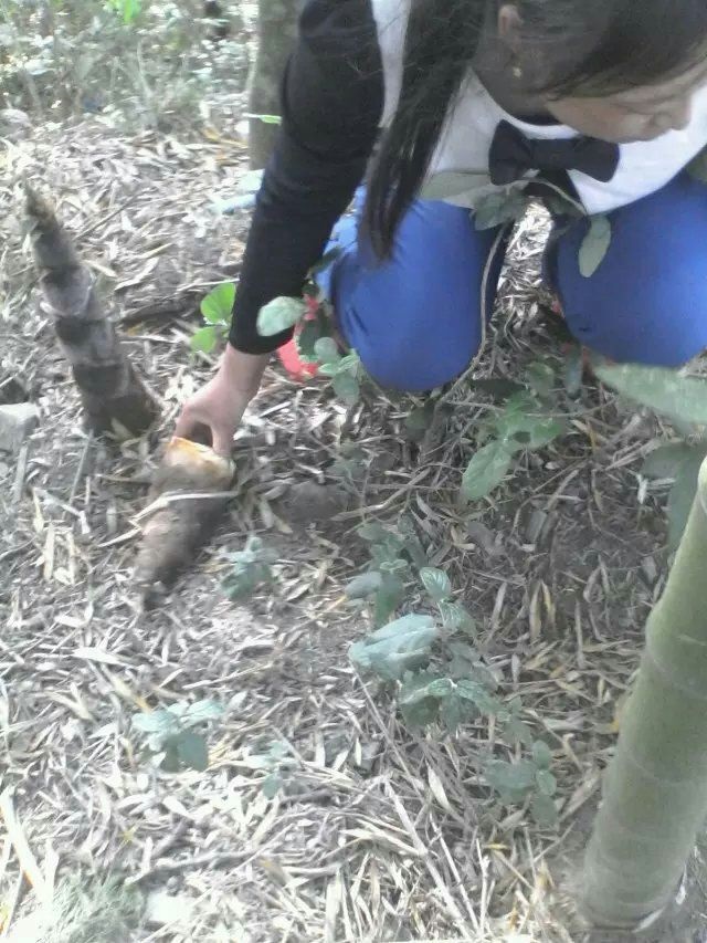 嫂子便迫不及待的带着弯刀去砍兰笋了,我们挑选了长的“俊秀”的笋子来砍。先用弯刀把埋着笋子的一层泥土刨开,露出一截光光的嫩笋茎后;就照着竹节根的纹路,“快、准、狠“的砍下去。就完事了,重复动作十几根兰笋就归我们所有了!