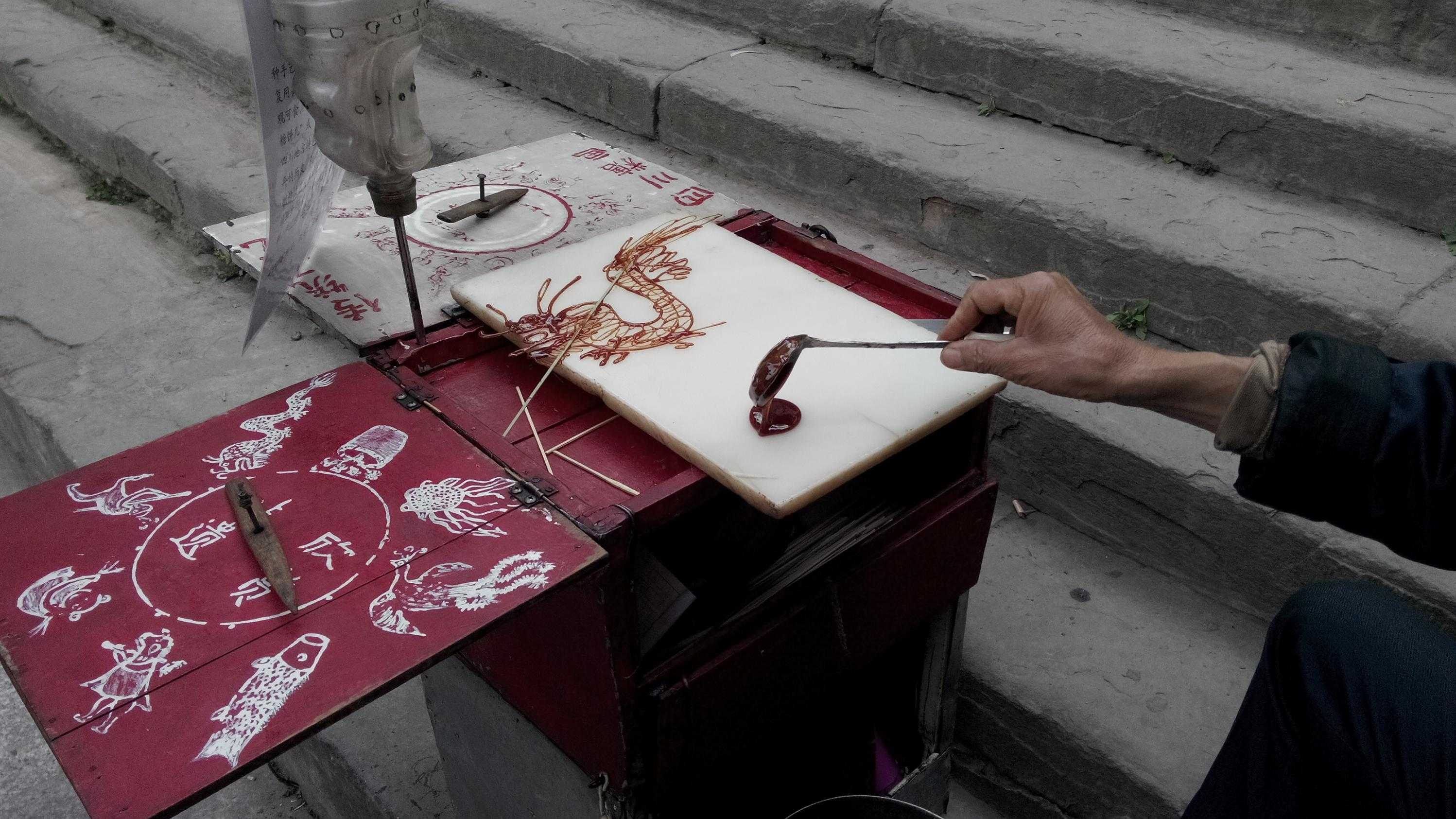之后,只见老人用一个铁勺舀起一勺糖浆,先倒了半勺在瓷砖上,用一个铁片快速的摊成一个半圆弧状。然后用剩下的糖浆在半圆弧上点缀,勾勒。眼睛、嘴巴……一气呵成。展现在我们眼前的便是一条活灵活现的鲤鱼、最后老人放上竹签,轻轻一提、一幅鱼跃龙门便做好了,我不禁被老人的技艺惊呆了。