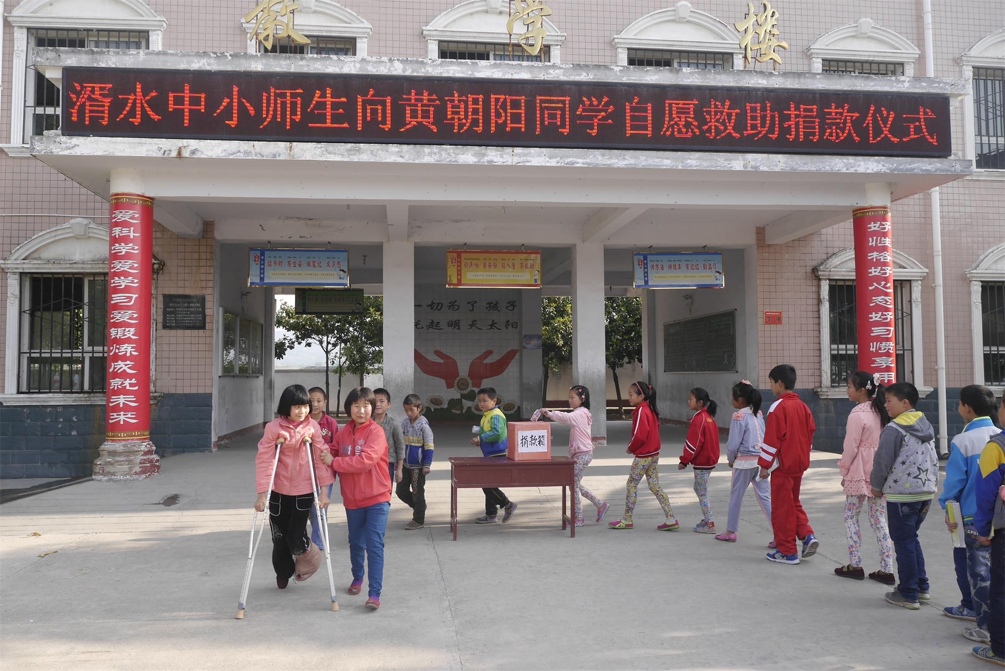 “这是心的呼唤,这是爱的奉献……”5月5日早上,湑水中小师生开展自愿捐款救助黄朝阳同学的活动。