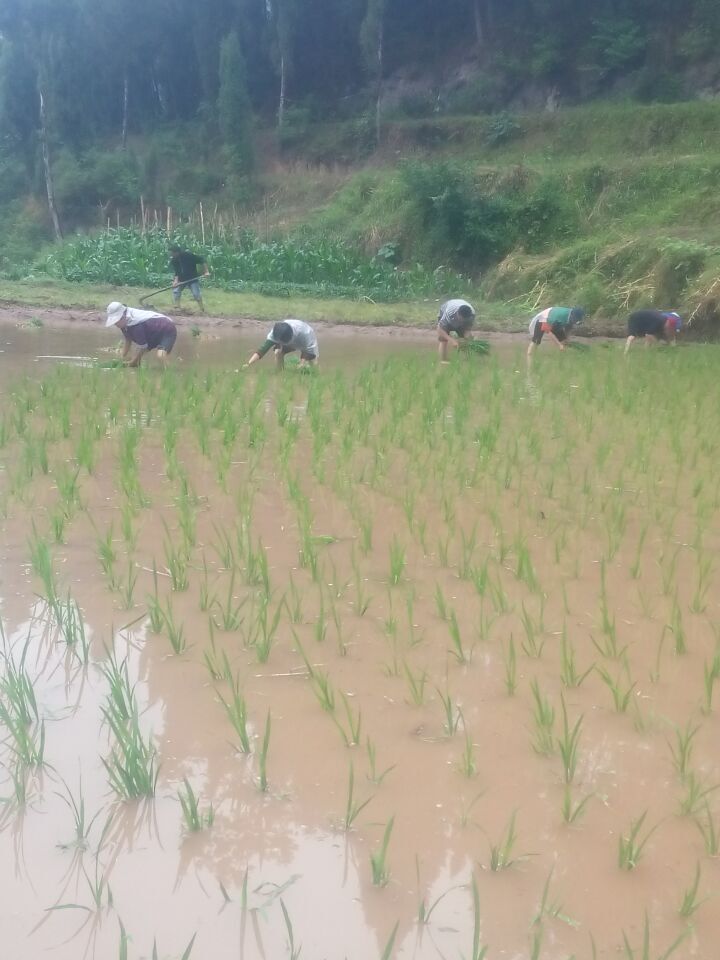 栽秧是辛苦的,又是快乐的,同时有时需要技术的,卷起裤管,挽起袖子,下田去把秧苗一棵一棵地插入水中的稀泥里,不能插太深,也不能插太浅了,因为插秧的深浅决定了秧苗的成活率。水田里,一个个忙碌的身影,弓起的后背,构成了一幅自然美好的图画。