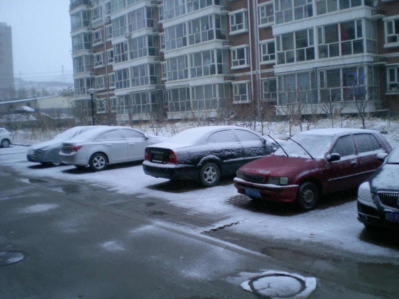 雪飘飘扬扬地下着,没有冬天那么大的雪片,只是一些小雪花从天空中飘落下来,轻轻的、慢悠悠的。这时的风也不大,任由雪花在空中起舞。雪花落在地上静静的,散落的雪花盖住了大地,马路上汽车驶过,雪一会儿就融化了。