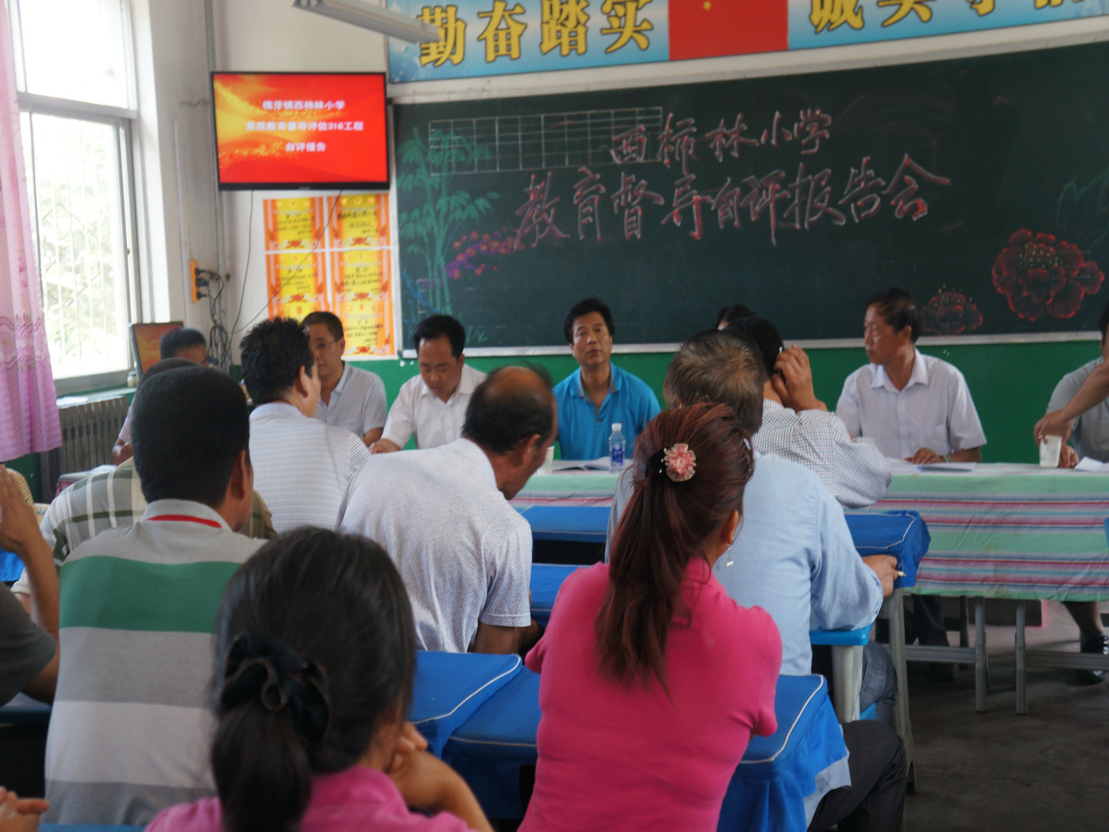 6月9日下午,督导组对槐芽西柿林小学进行了素质教育“316”督评。出席本次自评报告会的与会领导有县督导室主任汪宗乃,县督导室督学张永峰股长,槐芽镇主管教育纪检书记朱仓平,教委专干张晓辉,西柿林村张书记等。县、镇、教委、村组等相关领导、部分家长代表和全体教师五、六十人参加了自评会。