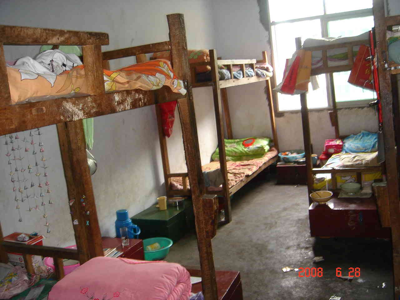 首先是我们的宿舍,瞧,地面多么干净,这是我们劳动的成果!再往上看,床依旧是木头做的,虽然看起来十分落后,但它却带给了我们温馨,快乐。我们每周来的时候,都会把袋子,书包分开放,然后拿出自己的小饰品,把自己的床头或床尾打扮的漂漂亮亮!让我们在这里也依然感受到家一般的温暖!