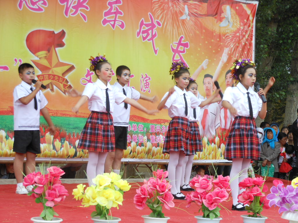 检阅结束后,进行了文艺表演。老师们一个个化着清淡高雅的妆,穿着漂亮的裙子,优雅地走上台,摆了几个造型,交替地走着猫步向大家展示着她们妙曼的身姿和典雅的服饰。她们宣布了重兴学区文艺表演正式开始。