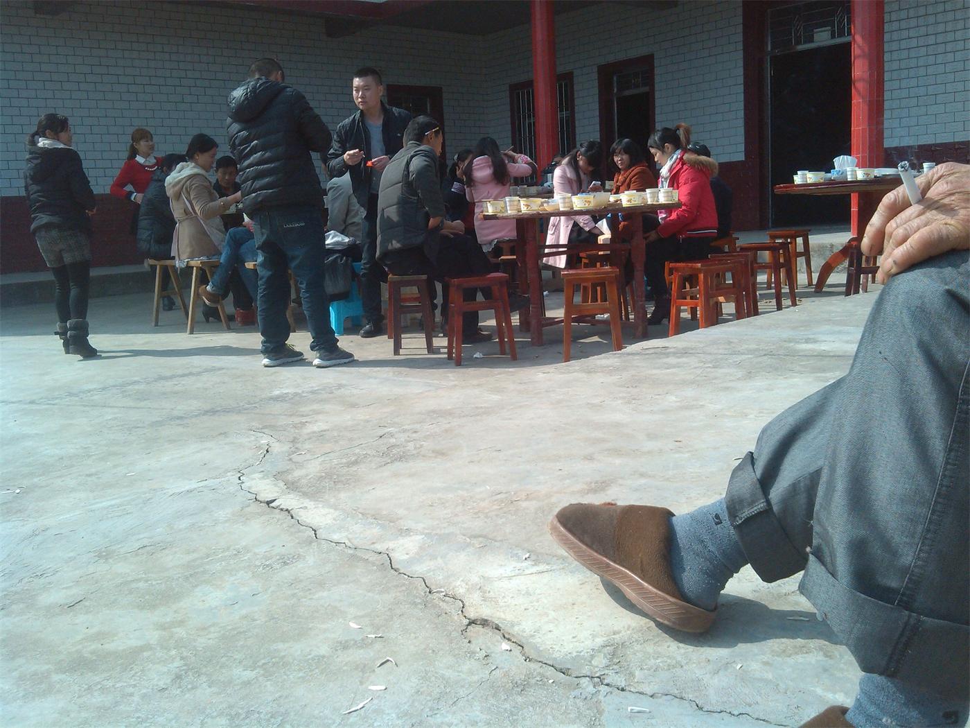 在隆隆的礼炮声后也随之开席了,每桌都坐满了人,还有没坐到的人就坐在一旁讨论着家常,有说有笑的。吃饭的人们吃的津津有味,大伯他们出来看到这些宾客露出了笑容。希望他们每天都能开开心心!