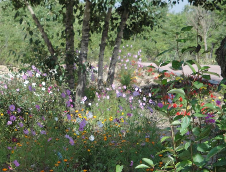 我往里面走,我一下子闻到了浓浓的花香,我突然看见天上飞满了花瓣,有紫色的牵牛花、橙色的野菊花,还有白色的百合花。那绿色的青草,好像富贵人家广大的绿地毯一样。我刚走过一个拐角就看见离我将近600米的地方有连绵不断的山,一高一低的。