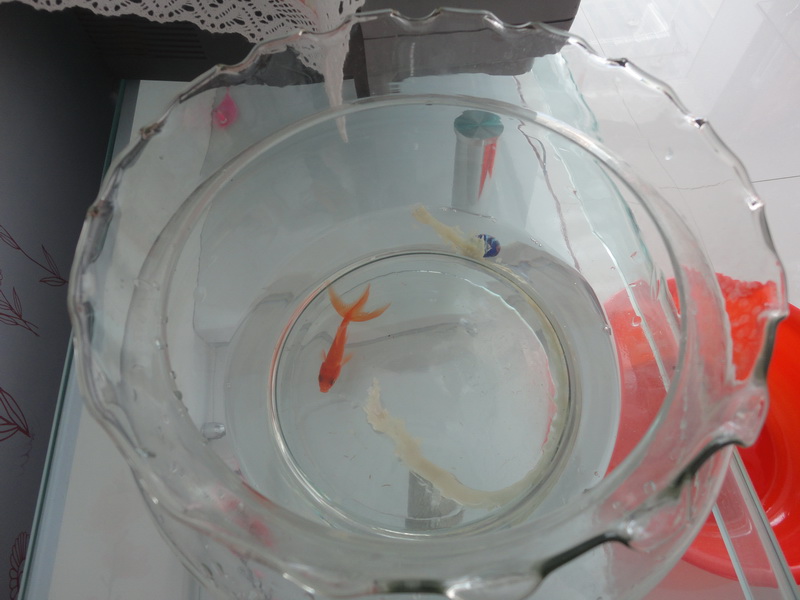 晚上,在灯光的照耀下,小金鱼仿佛穿上了阳光般衣服,灿烂无比我看它如此美丽。便给它起了个名字叫"美人鱼"夜晚我上厕所,无意中发现"美人鱼"呆在那里一动不动,我以为它睡着了,可是眼睛是睁着的,糟了我可爱的"美人鱼"死了,我边哭边去找妈妈,妈妈见了,毫不在意的说:"宝贝它没有死,只是没有眼睫毛,睡着只能睁着眼,瞧把你吓得!"噢,原来它没死,真是虚惊一场啊!"
