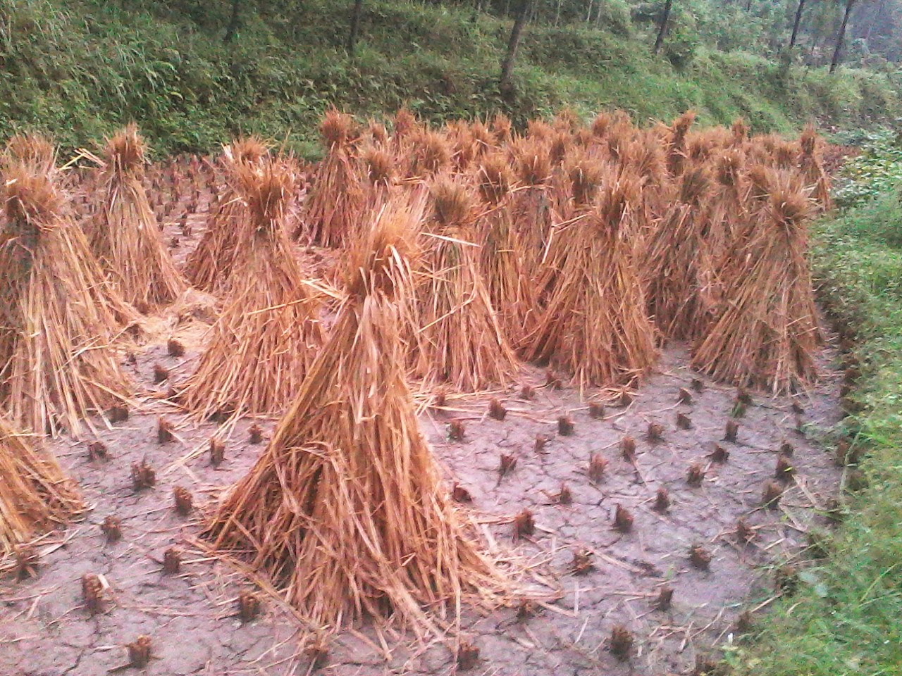 打完谷子后,农民把稻草拴成一把一把的稻草垛,立在田里,等稻草垛晒干后就围着一棵树把干稻草垛一层一层的绑在上面,存着可以给家里当柴烧。