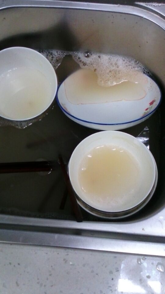 洗完碗后,碗上有许多的泡沫。这是一个重要的环节,一定要把碗上的泡沫冲干净了。