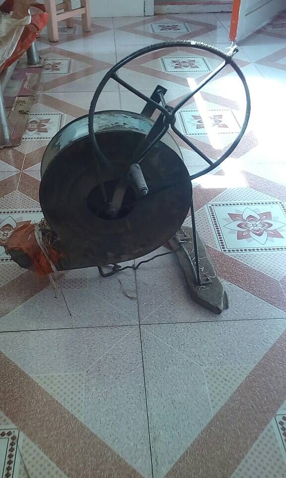 它的构造从宏观的角度来看是十分简单的。一个铁皮圈,里面装置着一个形状类似风扇的东西。在铁皮圈的外围还安装着一个小铁圈,上面绕着一圈皮带,铁圈上还焊接着一个小把手,是用来操作搅动皮带使里面像风扇的那个物体转动,从而产生风。
