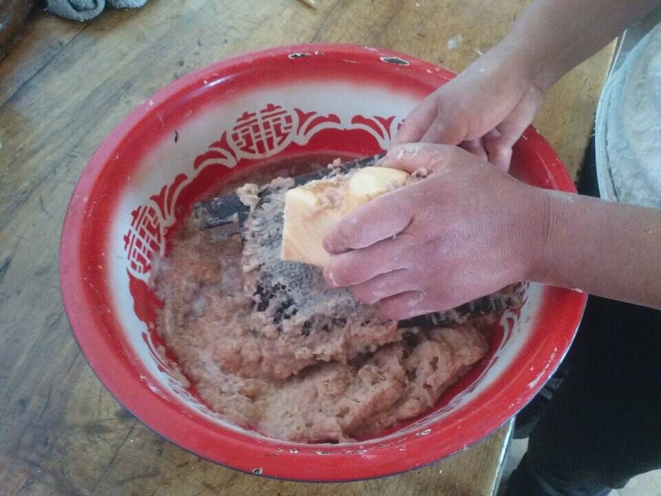选取新鲜的洋芋,最好是刚刚从地里挖回来的。将其用清水将泥土冲洗干净,再用自制的“沫子”,将洋芋一个小头抓住,另一头放在沫子上,来回研磨。因为味道太香,所以磨够一盆子才够吃。将准备好的洋芋磨完后,开始兑面粉。只有高手才能兑出最好的汤,当然,我妈妈就属于这样的高手,她娴熟的将面粉一点一点兑入盆子中,直到她认为最好的时候。就开始正式做了。
