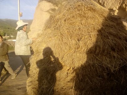 摞的时候要凭经验,一圈连着一圈,并且摞的麦垛要防雨,一个麦垛要放好些日子,所以不能有水进入麦垛中间,不然麦子一潮就发霉不能吃了。一年的辛苦也就白费了。麦垛摞好后,像一个大肚婆一样,中间的鼓鼓的,而且还很高,足足有十几米。看着就很有气势。