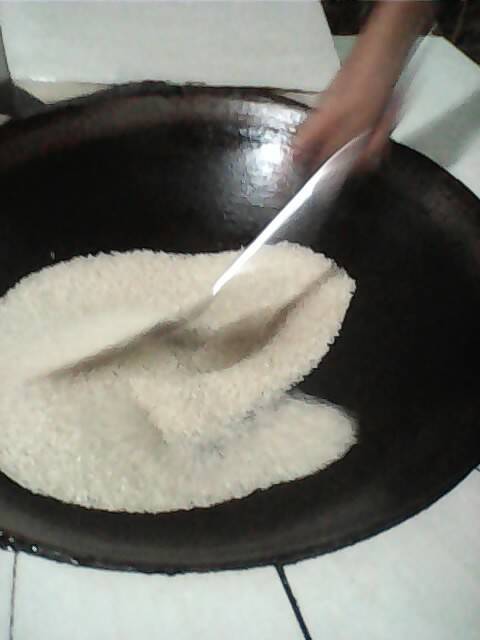 而后,用锅铲不停地翻炒着米,让米均匀受热,这样一来,米既不会变焦,也不会担心这边炒黄了,那边还没变色。待至金黄色即可出锅,但为了让米面粉更香,你可以在里面加些炒黄了的花生,花椒、椒子也行。