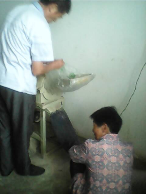 最后,我们就可以开始用专门推米的机器来把米变成米粉了。把米直接放入机器口,"轰,轰"几声米粉便从口袋中出来了。就这么简单,米面粉就做出来了,当你想吃粉蒸肉或粉蒸排骨时,盛一碗米面粉和着肉蒸就可以了呦!可香可好吃了!