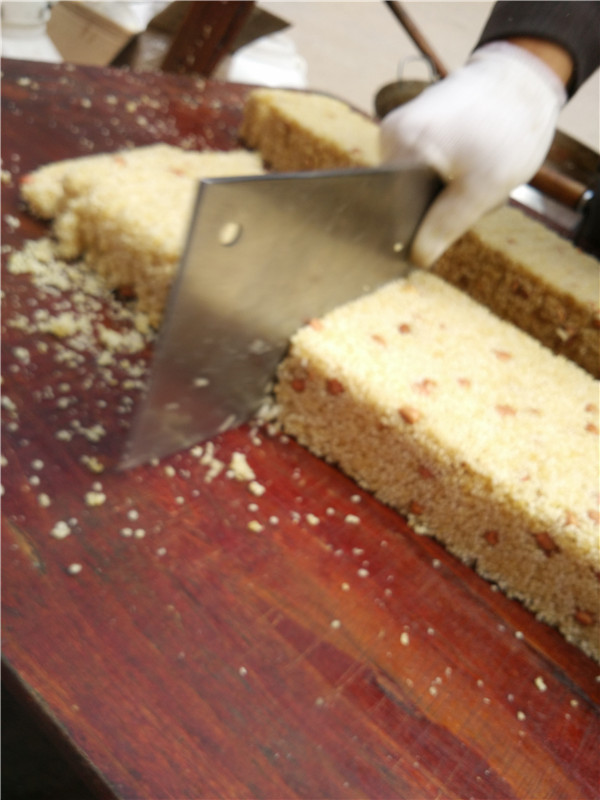 依照着桌子上的木柜,把小米粟整整齐齐地填到木柜中,小米粟这时候温度也冷却下来了,同时也成型了。叔叔取下这个木柜,整齐地把这一大块给分割成一小块一小块的。