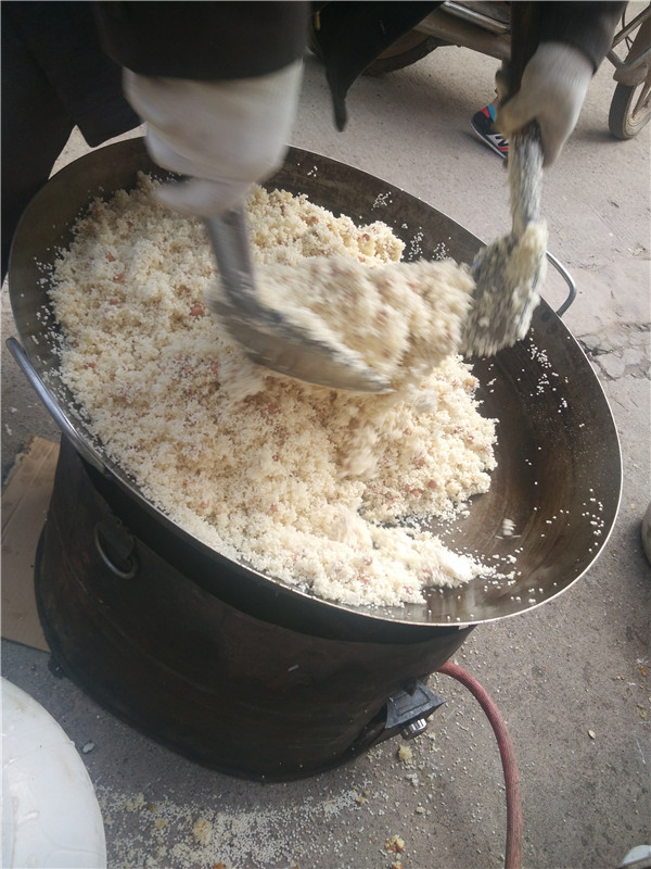 看看看…..逐渐地变化着!从白色到淡黄色再到金黄色。这里有个问题就是——为什么会变色呢?而且白色的小米粟在叔叔的搅拌下相互地粘在了一起。