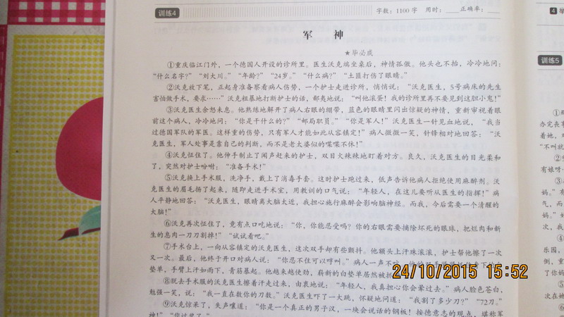 翻开阅读书,看了几篇文章,只有一篇名叫《军神》给我最深的印象:文中的主人公不仅是一名聪明的人,更是一名优秀的将军,他用自己的智慧保护了自己,也让那些瞧不起中国人的外国人感受到了,中国军人如关公刮骨之气概忍受的精神。