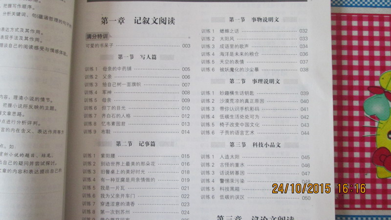 翻开阅读书的第一页,就是这整本书所有的文章题目的一个总汇。并且它们被分为三大类:记叙文、议论文、散文。一眼浏览下来,突然觉得自己是多么的无知,竟然连一些文章的题目都不知道是什么意思,终于知道自己为什么在这方面总比别人差!