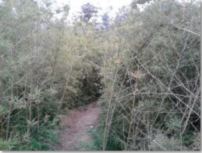 这是在用土堆成的山上,看这里面,周围都是竹子和杂草,只有中间这一条路可以走。周围的竹子生长的还算茂盛,望过去一片绿色。如果晚上从这上面走过,会心生害怕的。