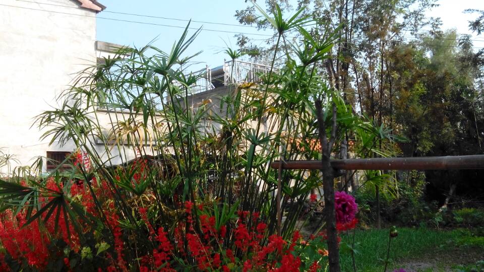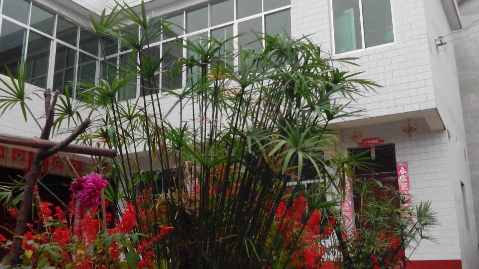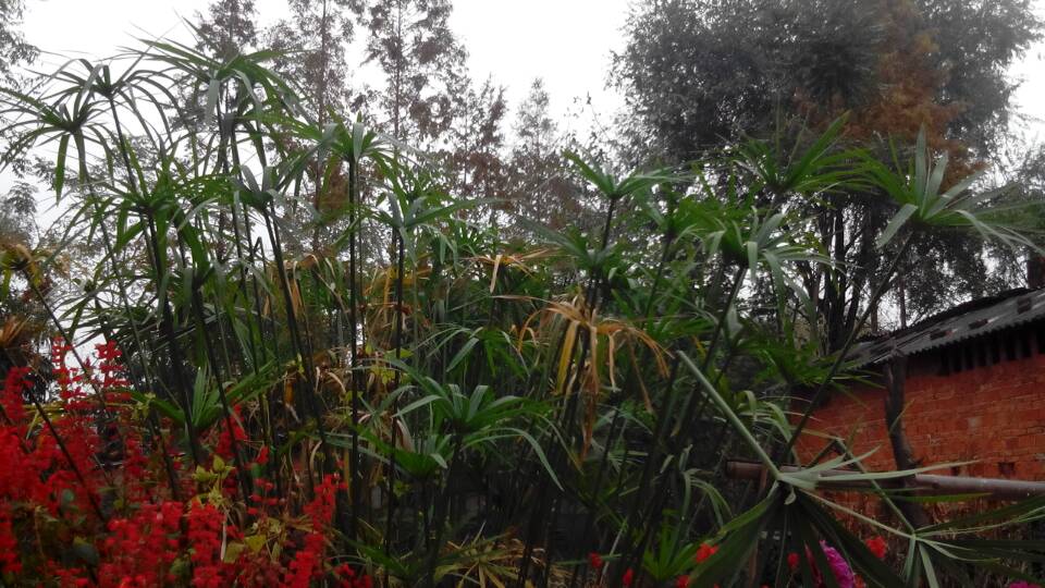 紫牡丹旁边有一株苔菀竹。它长得非常高,比我都高,我站在它旁边就像一个小矮人。苔菀竹的根系十分发达,只要根系不断,苔菀竹就可以不断抽出新的茎叶。我家的这株苔菀竹别看他长得那么旺盛,其实只长了半年多。而且它的茎是笔直的,就好像橄子树似的,只有顶端才长叶子。它的叶子像是一只大手掌,不过周围一圈都是手指头。中间的花蕊部分,在初夏时,会开黄色的小花。如果不注意看,压根就看不到。有时候,我欣赏苔菀竹就会把它当成竹子,因为竹子也和苔菀竹一样笔直、翠绿。