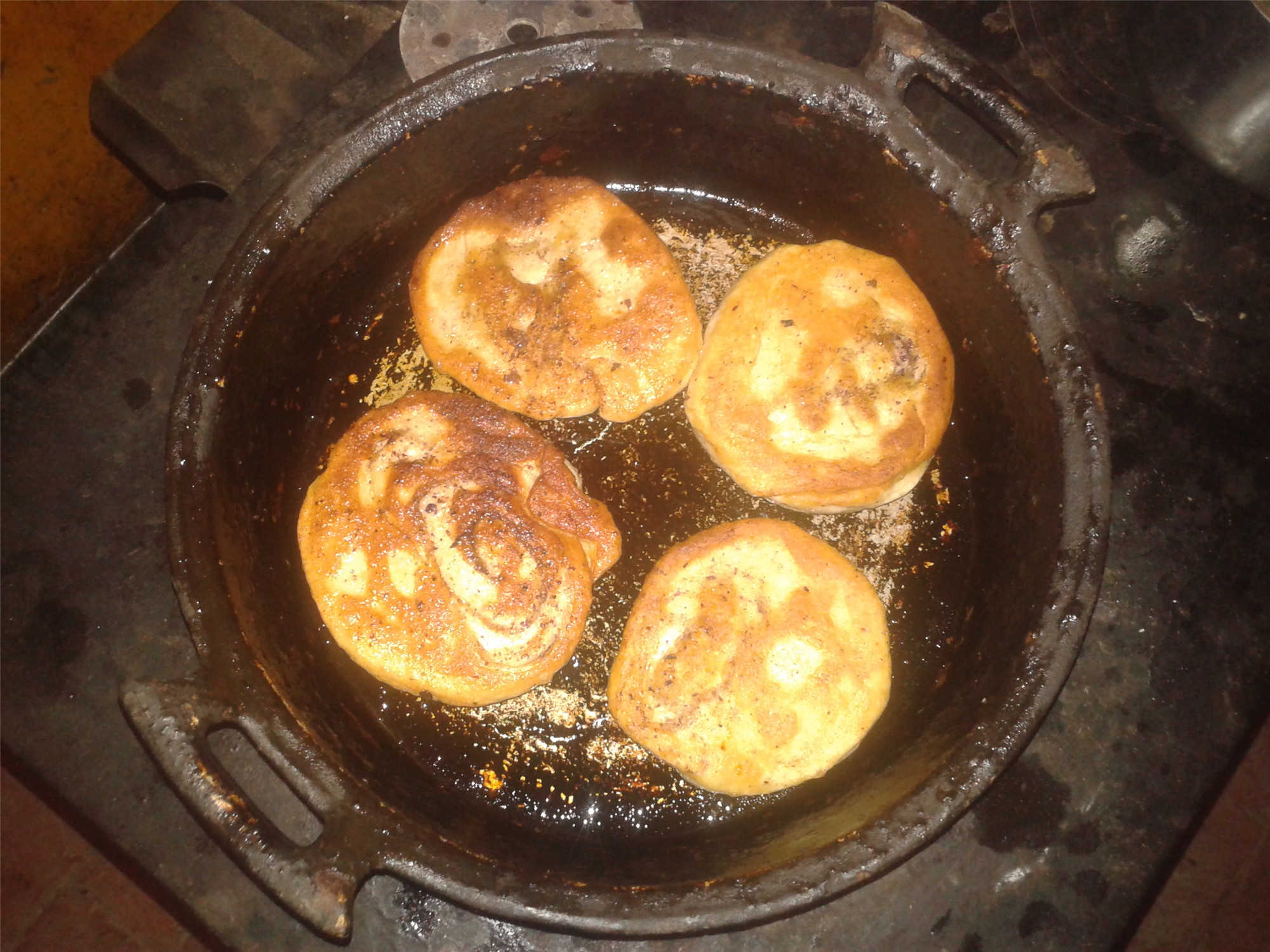 又在一瞬间变成了饼子的摸样,太夸张了吧千姿百态啊,然后再饼子的表面涂上了油,然后把饼子放在了锅里。在等待的时候我开始大胆的想象,出来的饼子是好吃还是不好吃。我发现自己都变成了一个吃货。