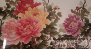 这幅十字绣上有八朵开得正艳的牡丹花,颜色由上到下逐渐变浅,姹紫嫣红,形态各异。花瓣层次分明,有黄色的、红色的、紫红的的、粉色的……花蕊就像一个熟睡的小精灵,躺在花的中心。其中黄色的那朵牡丹花犹如一个害羞的少女,躲在粉色的花后面,看起来羞羞答答的,怎会不讨人喜欢?
