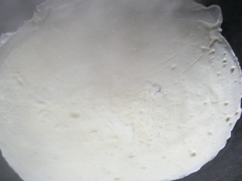 面水调制好后,就可以着手烙了!烙饼,关键在于火候,火候要不大不小,这样才会脆,颜色才会好!把锅预热好后,舀适量的面水,顺着锅边一圈往下倒,再迅速地用锅铲背把没有淋上面水的地方补上,等过一会儿,这饼基本成型后,就适当的给它翻一下,转一下,不出五分钟,一锅又香又脆的薄饼就做成了!