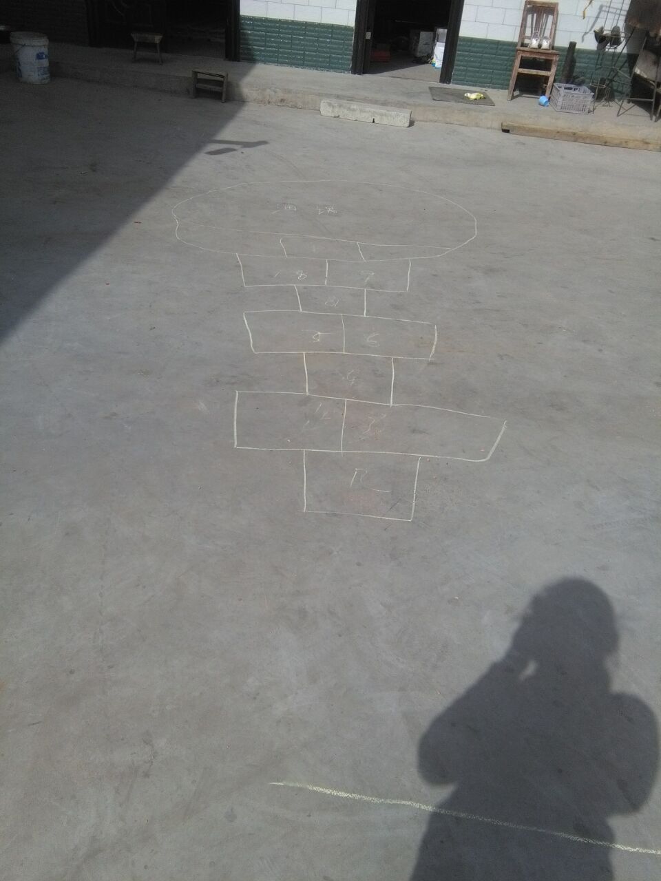 现在我们要开始玩了,第一个是我,我扔进去了,然后踩着2,3先是双脚,然后再是单脚,这样重复重复再重复,到头了,然后再返回来,到2,3格子的时候再捡起石头,这样就好了,接着再扔第二个格子,可惜我没扔进去,就让我的小伙伴去扔,也和我一样没扔进去。