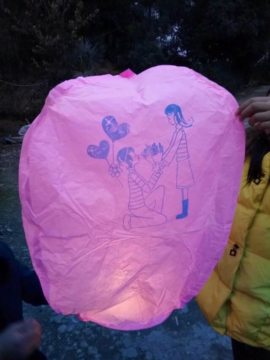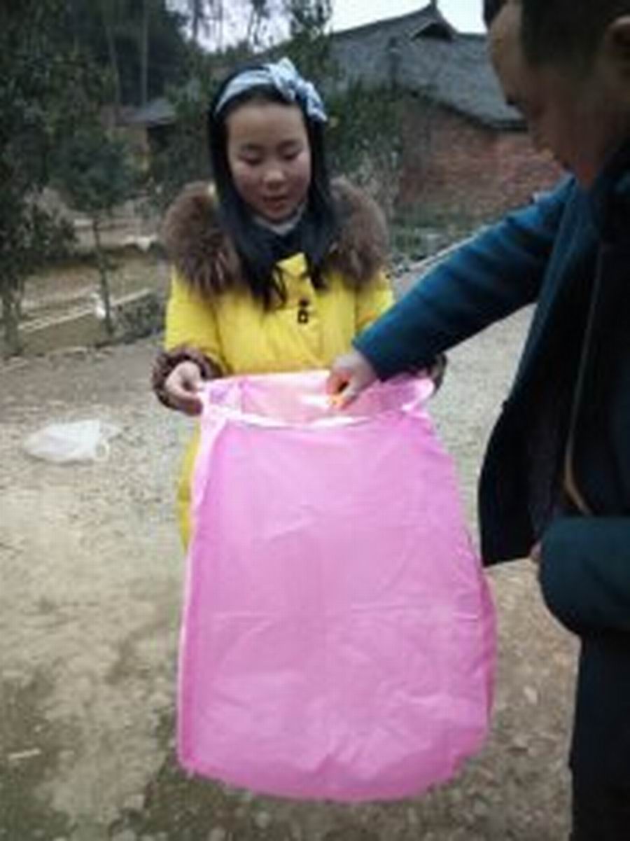第二步:两个人(我和爸爸)把孔明灯托着,将进气口尽量压低,以减少热气流失,但亦不可过低,以免氧气不足而熄火。同时四周之控制线必须拉直。大概1、2分钟以后,孔明灯内的温度就升高了。