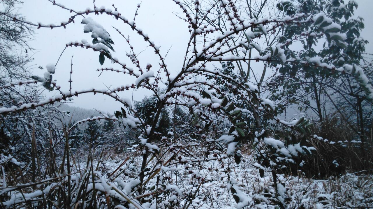 山上的风很大,夹杂着飞雪冲击着我的身体,有些睁不开眼。山穿起了银装,头顶一顶灰白的大帽。晶莹的雪装点着单调的树梢,仿佛它们才穿起冬袄,有了冬的感觉。那长满了路边的枯黄野草,也才入冬,藏在白茫茫之中,悄悄窥望难得的雪景。