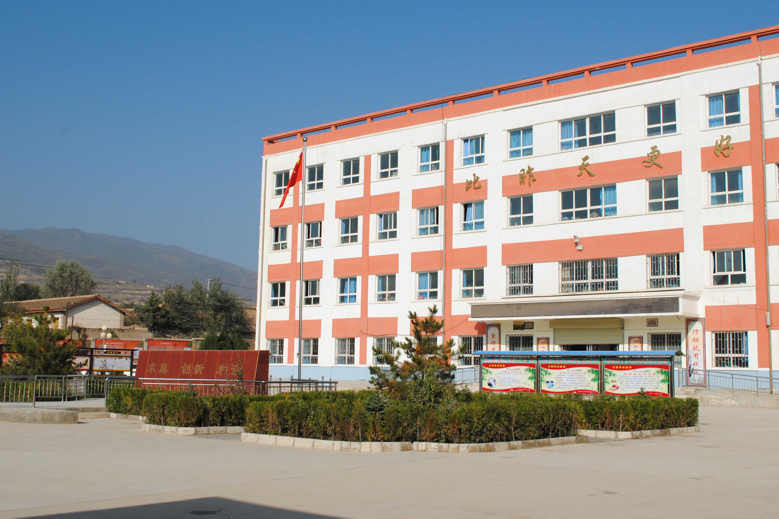 一轮红日从东方地平线上升起,最后一点薄雾也汇进了它的光辉。金色的光辉冲破了薄雾,从枝缝间透过,构成一个个美丽的光环。整个校园被这绚丽的朝阳染得红红艳艳的。