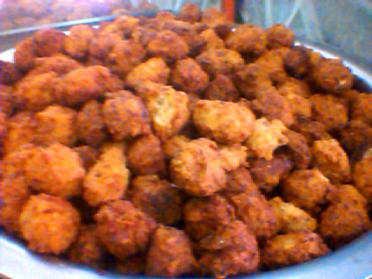 正当他(她)们吃主角时,配角也登场了,配角是肉丸子,由弄成末的猪肉,同样成末的萝卜,鸡蛋,面粉以及各种提味的如:蒜,蒜苗,生姜,葱等,还有各种调味料做成,最后用油一炸,看起来好看,吃起来有劲道,是我们小孩的最爱。
