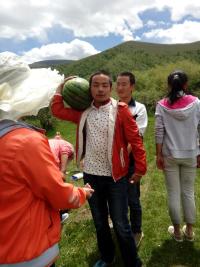 青海的夏天是那样的美,天蓝云飘,很适合我们出去野炊。不能辜负这么美的天气,所以我们选择了出去野炊。那是一个晴朗的早晨我们乘车到了青林,我们买好了熟食,蔬菜,还有夏天最能解渴的西瓜。图就是我们班的“坏蛋”,在搬大西瓜,然而这个西瓜比他的头还大。