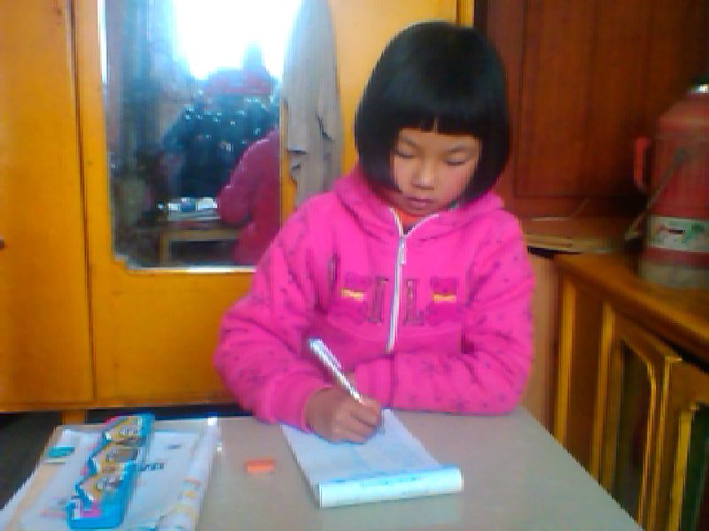 她写起作业来挺认真的,有时像一个中学生。姿势也挺正确的,如果遇到不会的题,她就不做,等最后把其他的写完再做。如果是在不会,她就来问我。我稍稍一提醒,她就会了。其实她脑袋挺灵活的,但就把大多数机灵用在吃上。