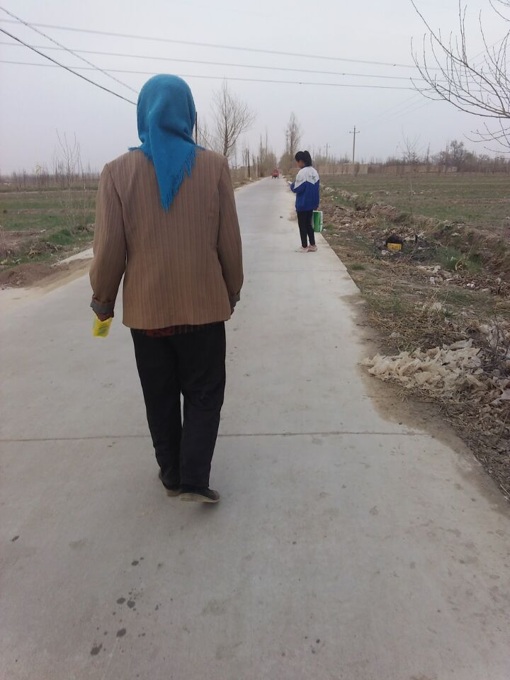她走在我们的前面,一只手里提着一箱牛奶,另一只手里提着一个塑料袋,里面装着一些韭菜,我和姐姐正想着要不要帮她,她回头了,所以姐姐就帮她提着牛奶,我帮她提着韭菜。