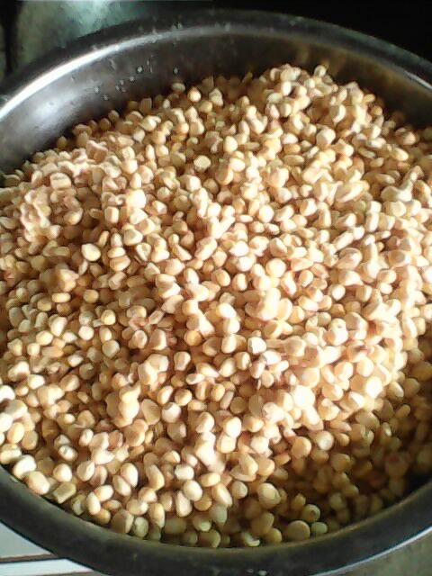 剥掉玉米的外衣后,就得开始剥玉米了,用手一粒一粒的往下剥,因为玉米还很嫩,所以每到这时,我总会沾到一手的玉米浆。 玉米粒剥好后,就把它们装在细筛上,把胡须筛出去,再用清水冲洗三四次,就可以推玉米了。