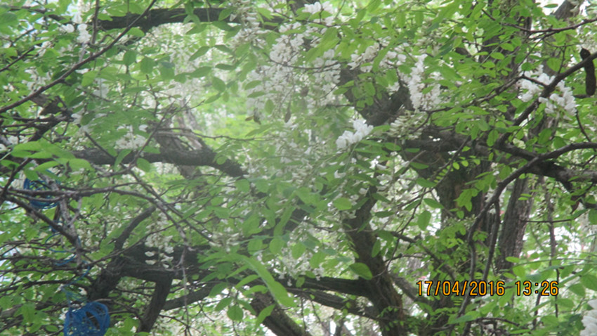 杨槐树上的每个枝干上都稀稀疏疏的长满了绿绿的新叶,绿叶中透露出一簇簇雪白的杨槐花如果一阵微风拂面吹来便会有一股浓浓的香气扑鼻而来。