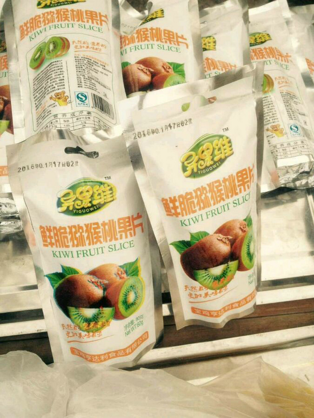 猕猴桃还可以做成猕猴桃果片,这个猕猴桃的果片是把猕猴桃切成一片一片的,还需要晒干,晒干之后,用一个像正方形的小袋子装了起来小袋子上面还有着猕猴桃果片五个字,看着包装,我觉得这种果片应该很好吃吧。