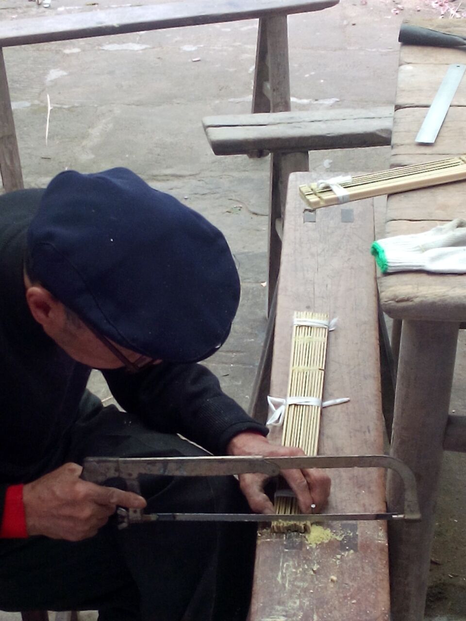 在我们这里,有一个风俗习惯,就是在人死后,会给他造灵房,造这个灵房的是一位老爷爷,他已经七十多岁了。他收到别人的邀请,就会来到这家为死去的人做灵房。他会先叫人砍几根竹子。然后再把这些竹子划成一条一条的竹条。