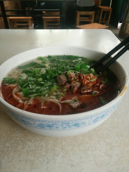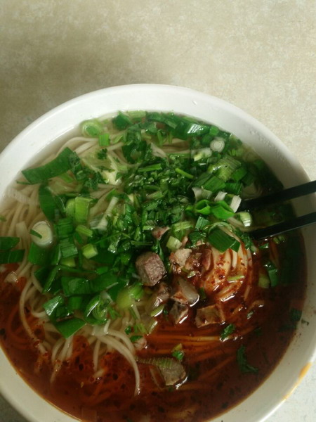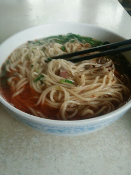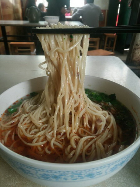 兰州的牛肉拉面,是兰州最为著名的风味小吃和最具特色的大众化经济小吃。牛肉面讲究的是一清、二白、三红、四绿、五黄,"清"指的是汤清,"白"指的是萝卜白,"红"指的是辣椒红,"绿"指的是香菜等的绿,"黄"指面条亮黄,这些材料少一样都不行。牛肉面中最主要的和最重要的要数牛肉汤了,牛肉汤是由自家秘制的配方和牛肉在高压锅中熬成的,所以每家的味道都不一样。在兰州,几乎每个人的早餐都是一碗热腾腾的牛肉面。一大早,牛肉面馆就开张了,当牛肉面汤的香气从面馆溢出后,四面八方的人就浩浩荡荡的聚集过来,面馆里挤满了人,实在坐不下了,就蹲在马路牙上吃。那味道,就是一个字——香!吃碗面后,喝汤,喝一口就忍不住要喝第二口,然后第三口、第四口……直到喝完为止,吃完后一天都精神。这美味,也难怪清代诗人张澍会这样赞美牛肉面了: