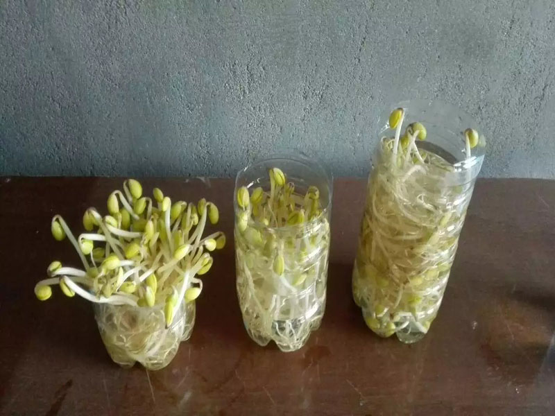 上个月放假回家,跟婆婆一起做饭的时候,发现豆芽已经不能吃发芽了。于是突发奇想,就把那些发芽的豆芽,放到用矿泉水做成的瓶子里。