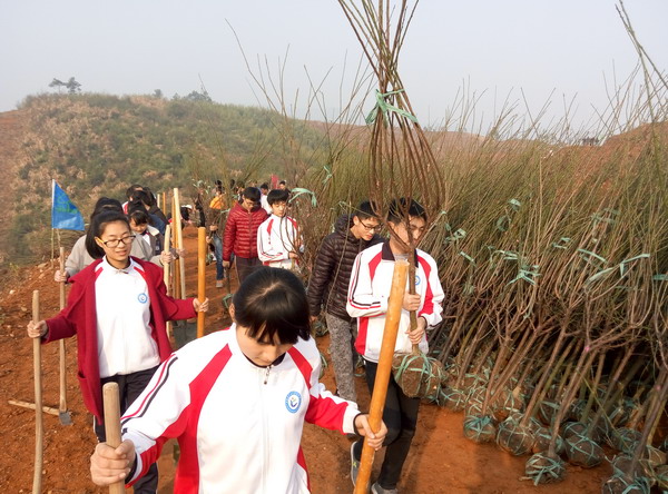 当天上午,天气晴朗,团旗校旗迎风飘扬。同学们在团委老师、年级组长、班主任与工作人员的指导下,将一棵棵树苗种在山坡上。