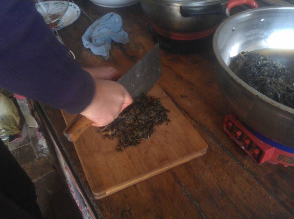 之后,再将焯过的苦苦菜捞出来,用菜刀一刀一刀切碎(约一指宽度),然后放进盘子中,调入清油,撒上辣椒面,加入盐和香料等佐料,然后搅拌均匀,苦苦凉菜便完成了!