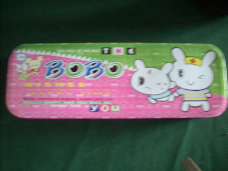 我的文具盒,是用红色的铁皮制成的。在上面画着两只小白兔,样子活泼可爱。它们的两对大眼睛好像时时在说"小主人你一定要好好学习,我们会永远和你在一起的。"所以,当每当我在遇到困难的时候,只要一看到它们,我的心中就充满了力量。不过,在边上还有几个字母"BOBO",它们所示的意思是什么,我还不知道。