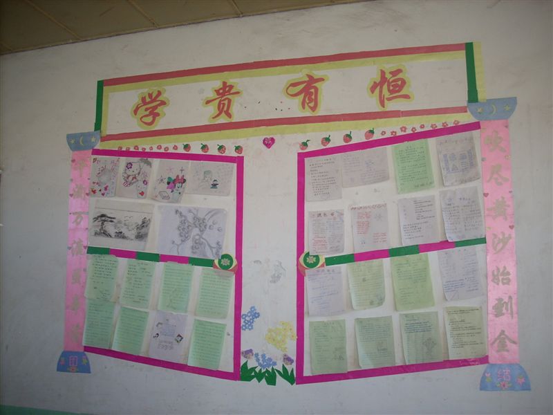 课桌后面上有一块"学习园地",横批写着"学贵有恒",两边各写着"千淘万路岁辛吹尽黄沙始到金"。说真的,学习园地旁常常是围满了人。