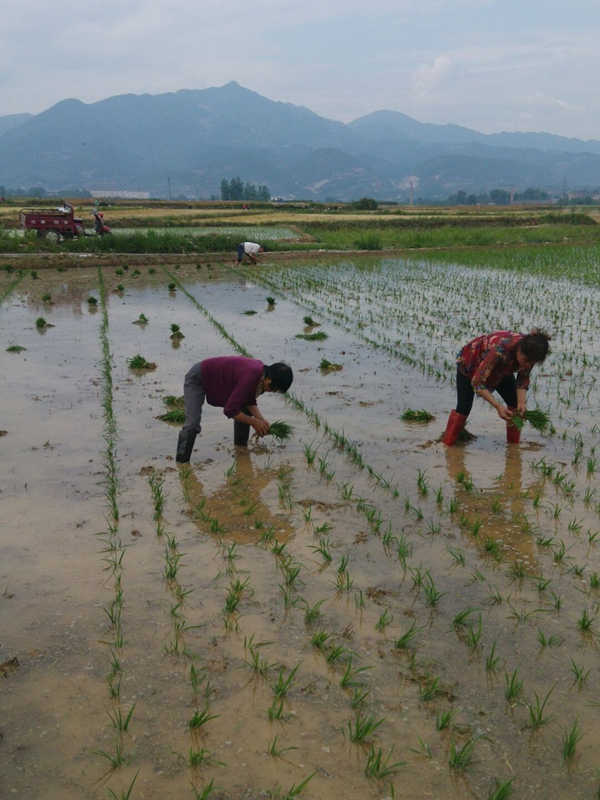 插其他秧的时候,不再需要秧绳和木棍,一人选一个格子开始插,只见他们猫着腰,迅速从身边摸出一把秧苗,抽掉绑在上面的草绳,从中取出一株秧苗,以标秧为准,以相同的株距秧插进水田中……他们像是在比赛 ,只听见哗哗的水声,不一会儿每个人所在的格子里面都已经有了一大片绿,几个小时后,整个水田被绿色的秧苗覆盖。