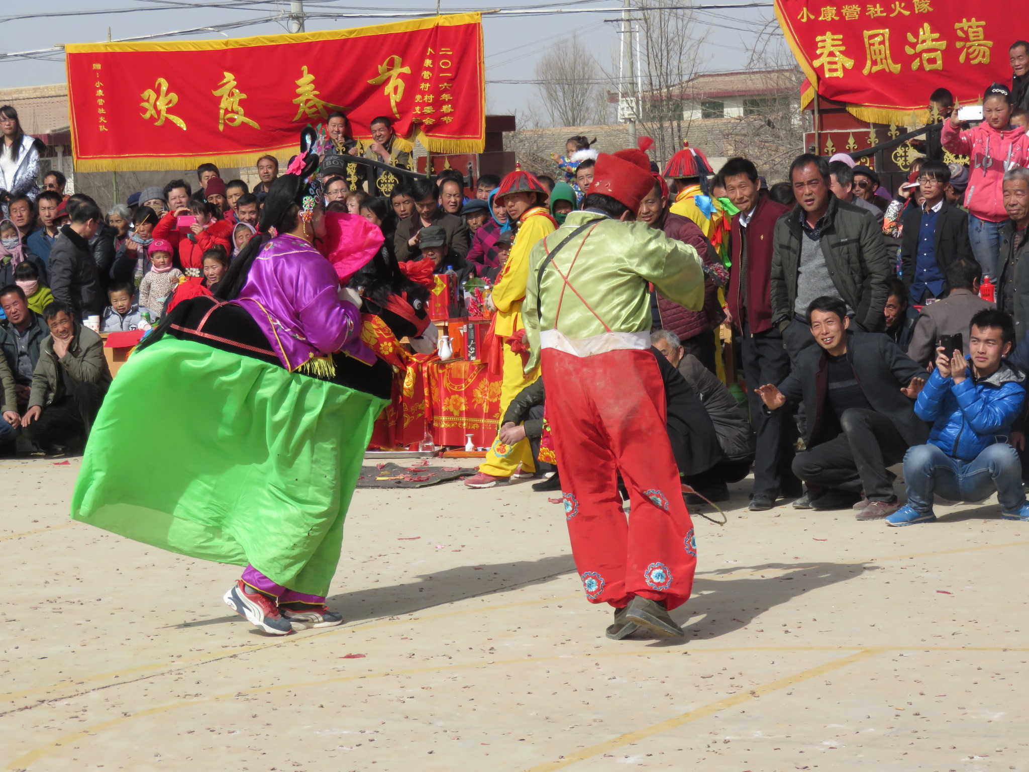 这单单只是其中的一部分。更有趣的还有“旱船”、“神驴”。“旱船”是一只很漂亮的人工船,船里有一位羞涩的姑娘。外面是陪船的姑娘个个长得如花似玉。船外的老汉划着船,样子逼真又滑稽。