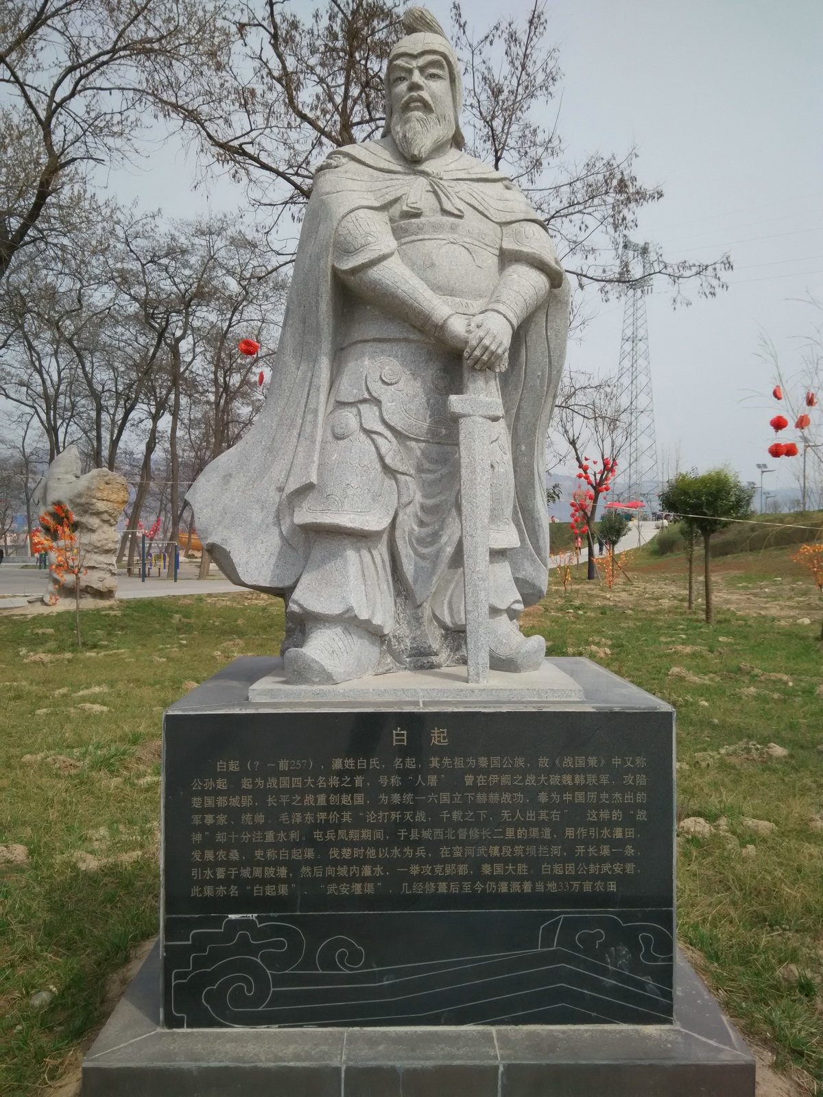 妈妈带我去另一个地方,我又看见了一个石像,这个石像看起来比李冰的庄严一些,他也拿了一把剑,但我不会去拔那把剑,因为我没有那么笨。李冰的剑拔不下,他的剑当然也拔不下来。他戴着头盔,穿着战袍。我猜他是战国四大名将之一吧!我玩了一会儿便回家了。这些都是漂亮的风景图。