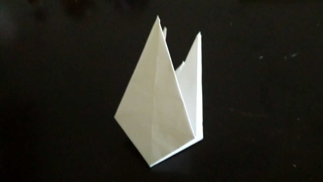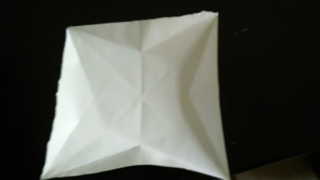接下来就是制做千纸鹤的步骤了。我们刚刚折的线就要发挥巨大的作用了,将我们第三次折的线所形成的四个三角形立起来,然后捏住每个三角形的高。同时向中间用力,接下来整理一下正好的半成品。这样一个千纸鹤的雏形就完成了。