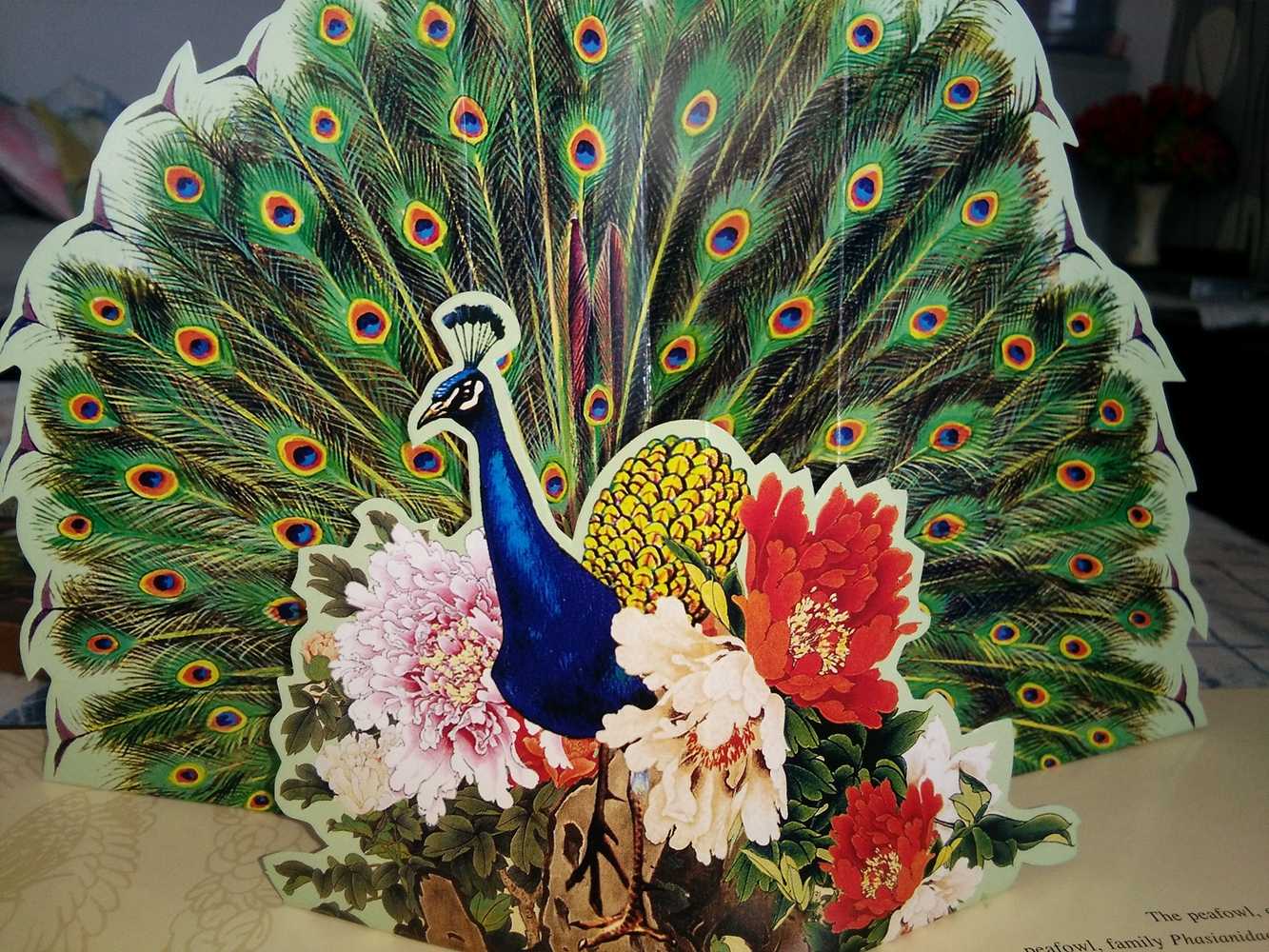 从外观上看就很美观了。这是以“孔雀”为主题的邮票。翻开第一页就会看到一个立体的孔雀开屏出现在眼前,就像一个高傲而又风骚的女子。第二页上的孔雀与第一页上的大不相似,它给人一种安静而又祥和的感觉,瞧她的眼睛是多么炯炯有神,再看她的身子是多么的婀娜,我似乎觉得邮票多么的珍贵了。